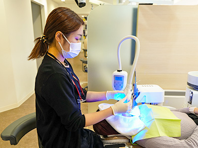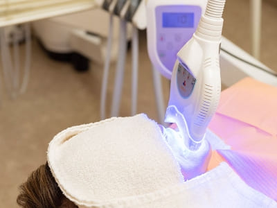 歯科医院で行うホワイトニングです。ホームホワイトニングより濃度の高い薬剤を用いて特殊な光を30分程度当てて作用させる方法です。複数回行うことで白さを持続させます。